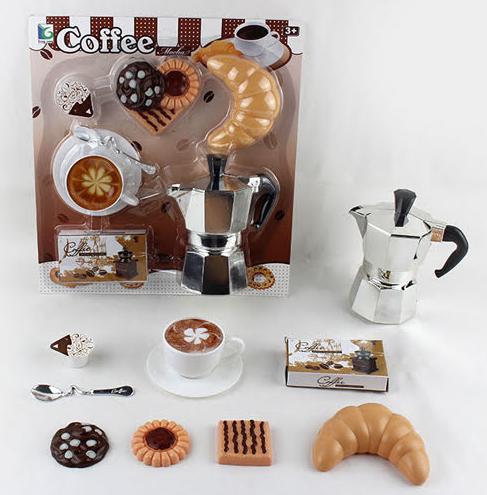 W zestawie 10 elementów. Wszystko co potrzeba do przygotowania smacznej, włoskiej kawy - kawiarka, kawa, filiżanka ze spodkiem, łyżeczka, śmietanka, ciasteczka, rogalik.