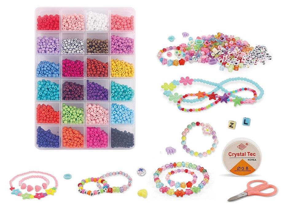 Koraliki zapakowane w plastikowy pojemnik, z 24 przegródkami, w każdej z nich inny kolor koralików.