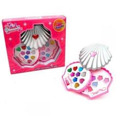 Zestaw kosmetyków do makijażu dla lalki w kształcie muszelki.