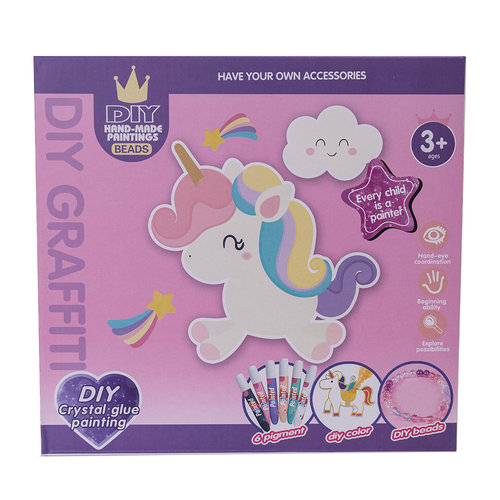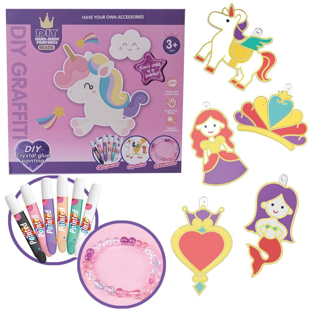 W zestawie 6 elementów tematycznych do dekoracji, 6 farbek, zestaw kolorowych dżetów, łańcuszki, koraliki, żyłka, pęseta.