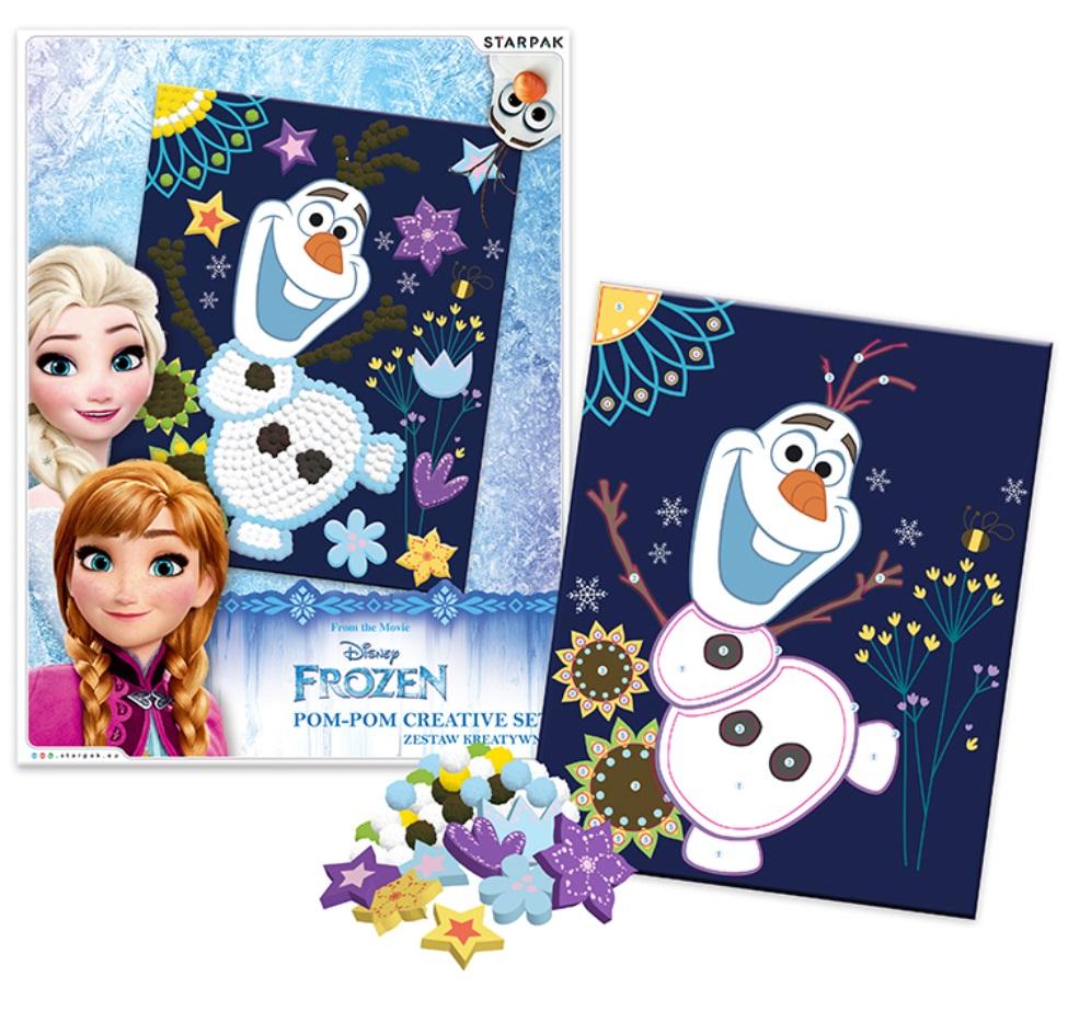 Zestaw kreatywny Frozen Pom-Pom z kolekcji Starpak to produkt, który sprawi frajdę dziecku i umożliwi stworzenie pięknego obrazu o ciekawej fakturze wykonanej z kolorowych pomponów. W zestawie znajdują się: 1 obrazek z grafiką z ulubionymi bohaterami, 8 piankowych kształtów, 1 klej i 265 kolorowych pomponów. Na odwrocie opakowania znajduję się instrukcja przyporządkowania pomponów do numerków umieszczonych na obrazku.