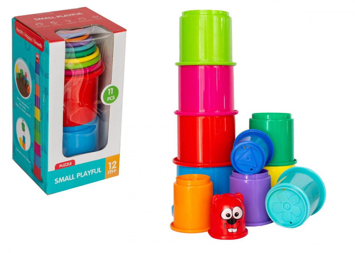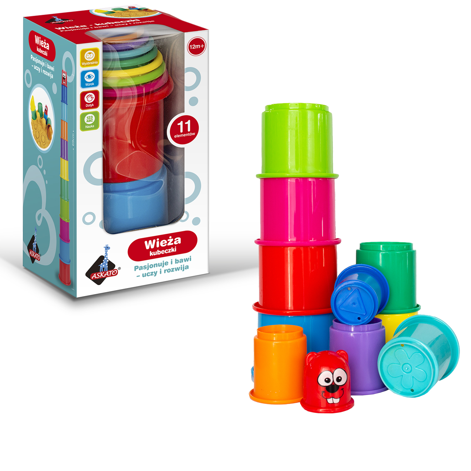 Zestaw 11 kolorowych kubeczków do zabaw w wodzie. Teraz kąpiel będzie jeszcze bardziej przyjemna.Kubeczkami można się także bawić w pokoju i układać z nich wieżę, która ma aż 69 cm. Wiek: 3+ Wymiary opakowania: 10.5x10.5x20 cm
