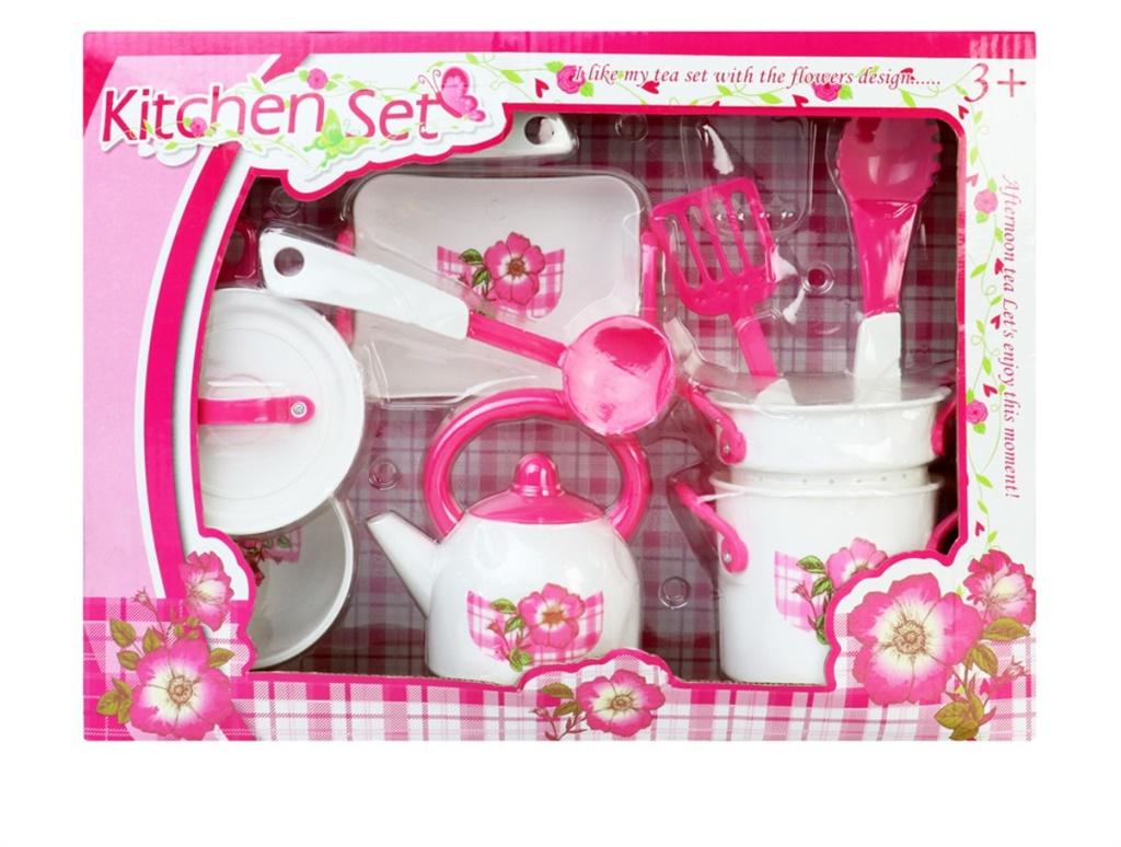 Zestaw kuchenny który zawiera wiele akcesoriów takich jak, czajnik, garnki, chochelki talerzyk i inne.