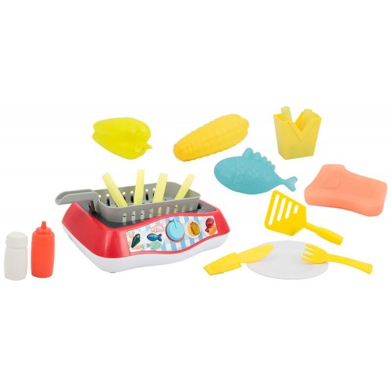 Zestaw kuchenny do magicznego "smażenia" gwarantuje dużo emocji podczas zabawy. Wystarczy nalać zimą wodę do specjalnego pojemnika, ustawić minutnik, nacisnąć przycisk wybranej potrawy i już można rozpocząć przygodę w kuchni. Do „gotującej się” wody wkładamy wybrany produkt, który magicznie zmienia kolor podczas „smażenia”! Kiedy weźmiesz produkt do ręki, jego kolor wróci do tego sprzed „gotowania”! Zestaw zawiera: urządzenie magic fry, koszyk do smażenia, talerz, łopatkę, widelec, nóż, solniczkę, pojemnik na frytki, pojemnik na ketchup, stek, 5 frytek, paprykę, kukurydzę, jajko, rybę.