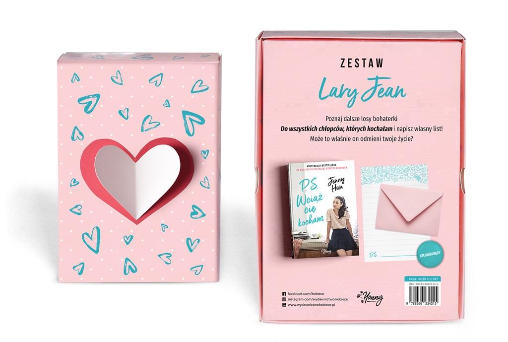 Zestaw zawiera drugi tom serii o Larze Jean, pod tytułem P.S. Wciąż cię kocham, przepiękny papier listowy oraz koperty, które posłużą Ci do napisania swoich listów, oraz przypinkę #TeamKavinsky! Całość znajdziesz w uroczym, kolorowym pudełku, w którym będziesz mogła przechowywać swoje listy i inne tajemnice.
