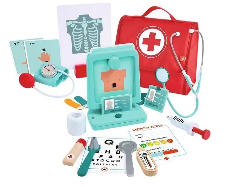 Czy Twoje dziecko marzy o zostaniu lekarzem? Zestaw Małego Doktora to idealna zabawka, która pozwala mu wcielić się w rolę medyka i rozpocząć własną domową praktykę! W zestawie znajdziesz aż 22 elementy, w tym stetoskop, ciśnieniomierz, karty pacjenta i nawet rentgen z projekcją obrazu! Tak, to działa! Wszystkie akcesoria wyglądają jak prawdziwe – realistyczne, ale w pełni bezpieczne dla najmłodszych. Do tego poręczna torba zapinana na rzepy sprawia, że mali lekarze mogą zabrać swój sprzęt wszędzie tam, gdzie potrzebna jest pomoc.