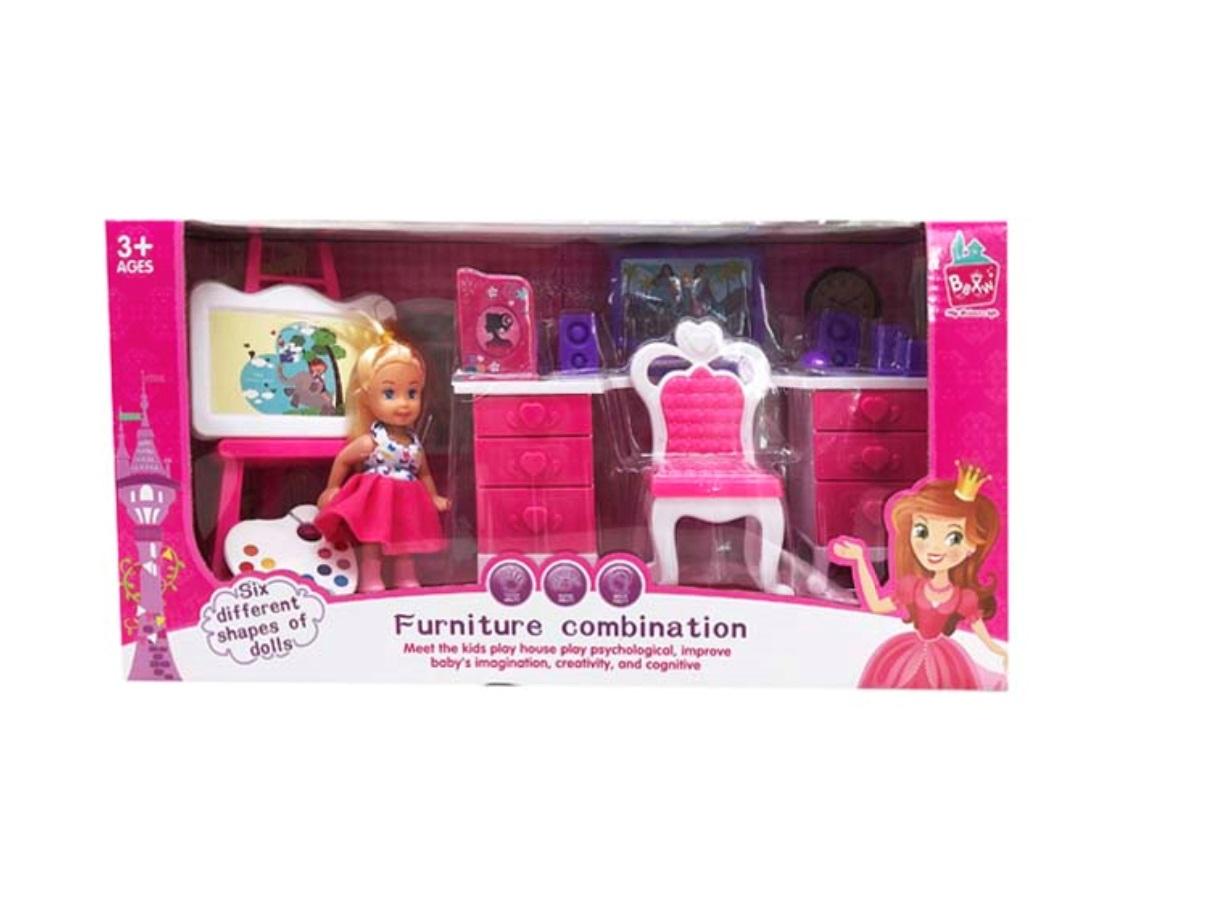 Zestaw biało-różowych mebelków i akcesoriów z małą laleczką. Zabawka dla dzieci w wieku od 3 lat.