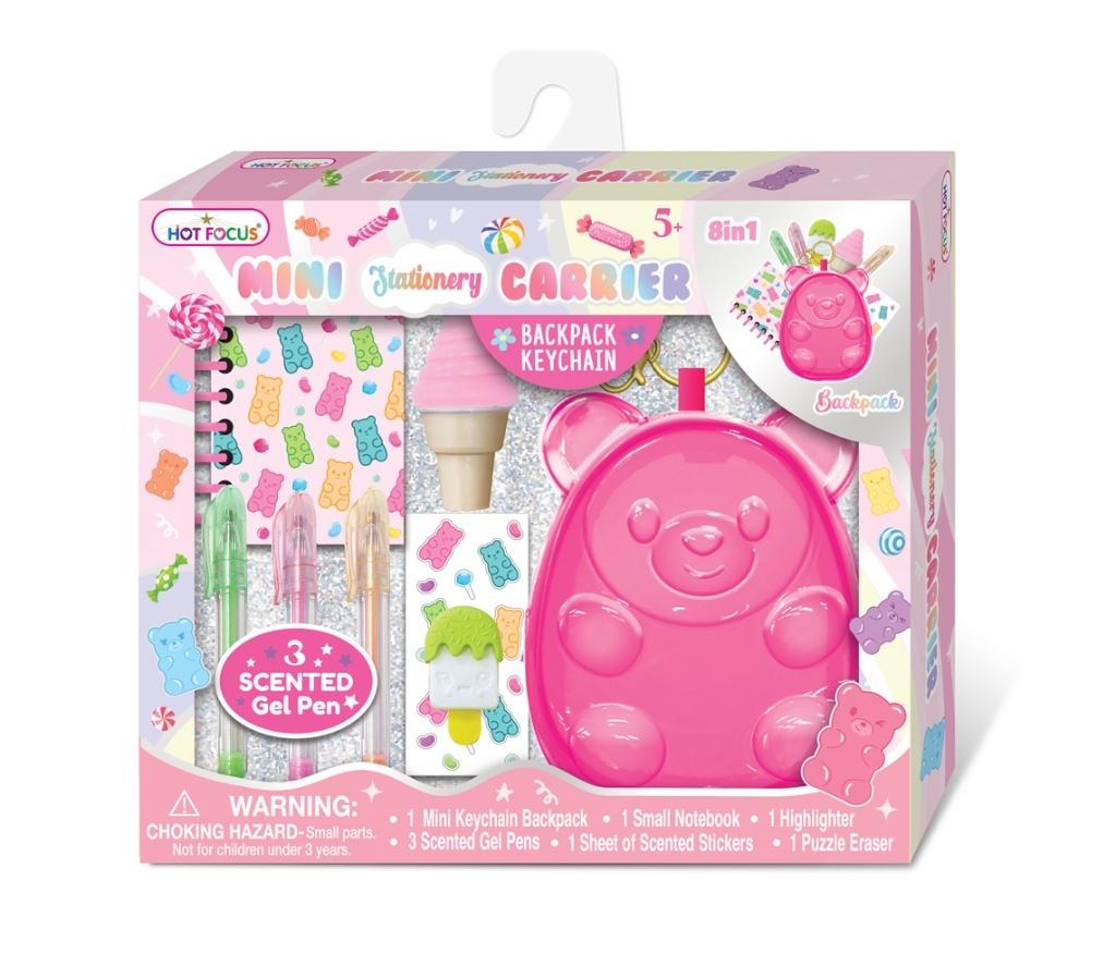 Ozdobny mini-plecaczek do schowania miniaturek najpotrzebniejszych akcesoriów! Plecaczek może być zawieszką, którą można zawiesić przy kluczach, plecaku czy torbie dzięki czemu można będzie go zabrać wszędzie ze sobą! Wiek: 5+. Zestaw zawiera: - mini-plecaczek zamykany na zamek - mini-notesik na spirali na zapiski - 3 żelowe mini-długopisy - gumka do mazania w zabawnym kształcie - 1 mini-zakreślacz - 1 arkusik naklejek