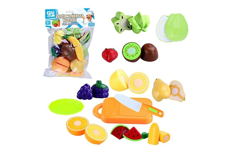 W zestawie: talerzyk, deska do krojenia, nóż, 10 warzyw.