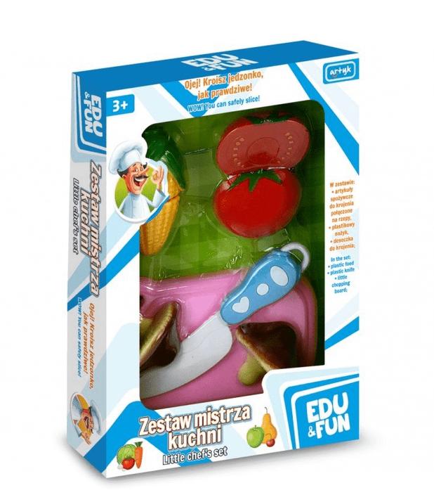 W zestawie: artykuły spożywcze do krojenia na rzep, deseczka oraz plastikowy nożyk.