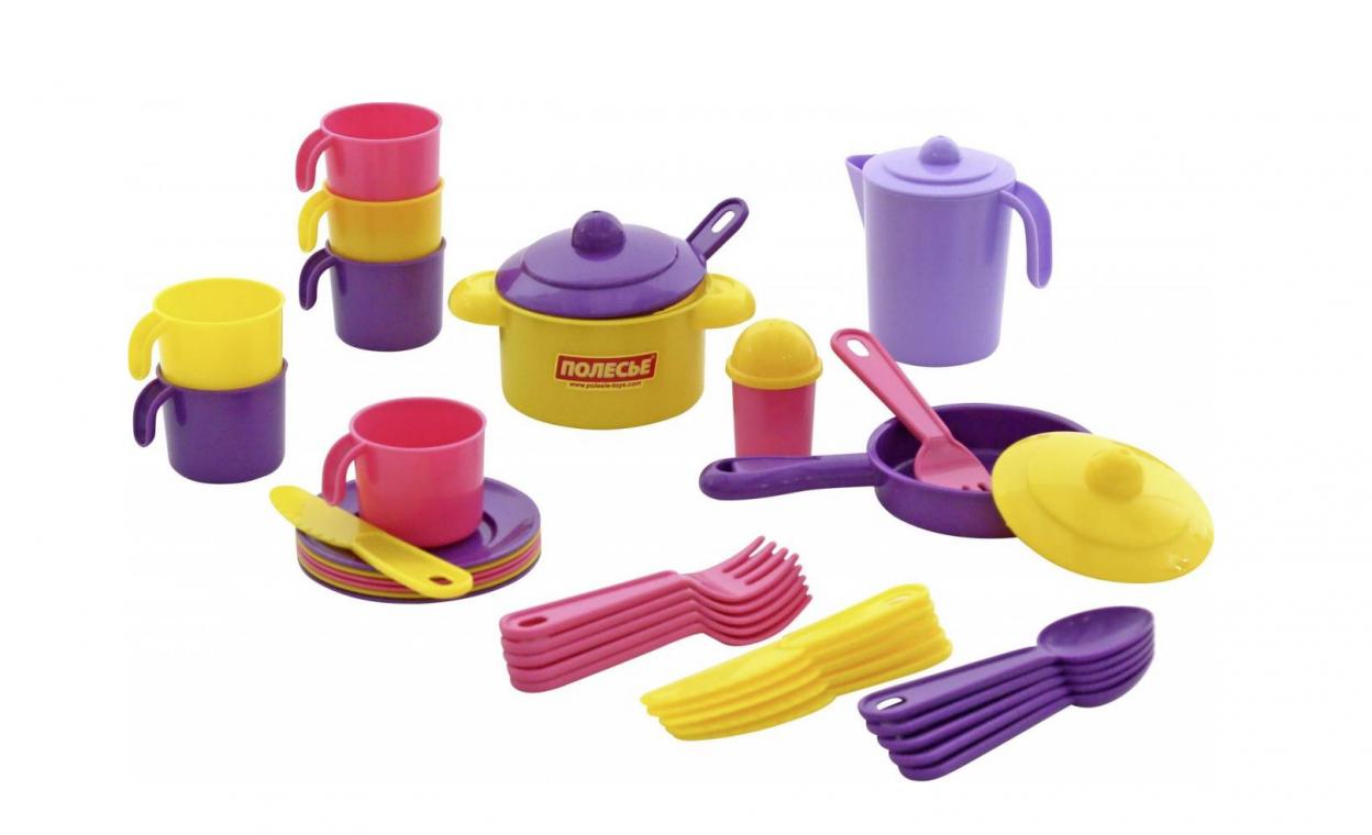 Zestaw naczyń na 6 osób zawiera sztućce, talerzyki, kubeczki, garnek, patelnię. Wiek 1+