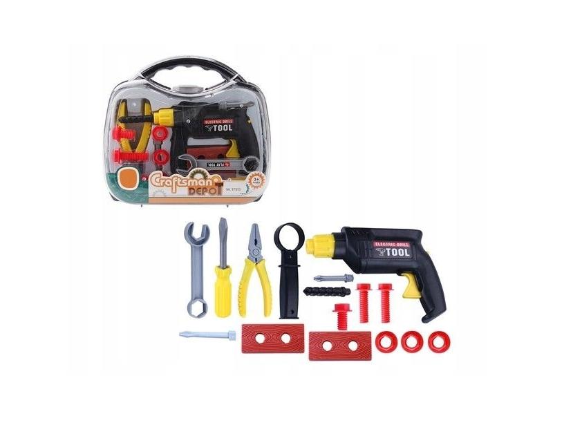 Zestaw zawiera 16 elementów, w tym wiertarkę na baterie.