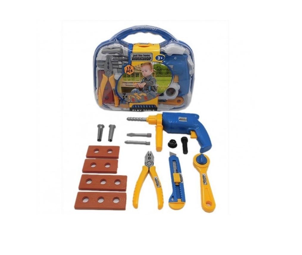 W skład zestawu wchodza: wiertarka z napędem frykcyjnym, kombinerki, klucz francuski, nożyk, klucz oraz 10 innych narzędzi i akcesoriów. Całość zapakowana jest w plastikową walizkę.