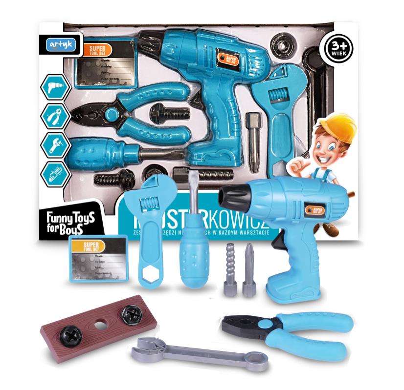 W zestawie: wkrętarka z dźwiękiem, kombinerki, śrubokręt, klucz francuski, klucz płaski, śrubki. Wiek: 3+ Wymiary opakowania: 31,5x22x6cm.