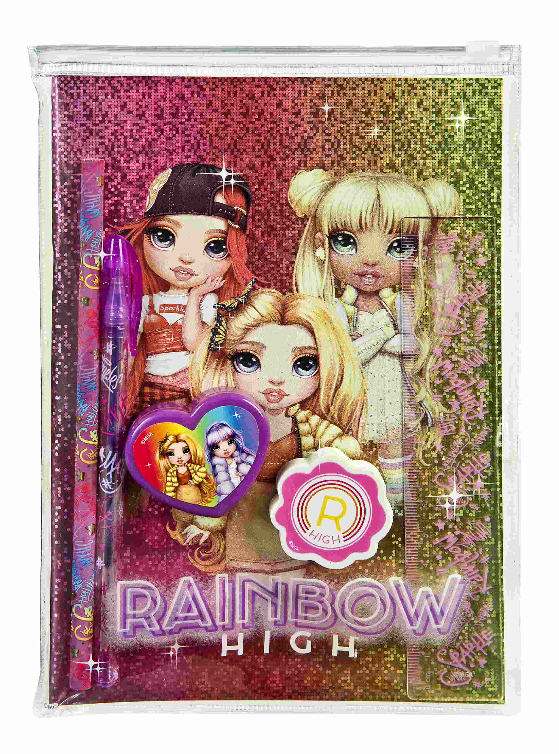 Zestaw kreatywny RAINBOW HIGH z notatnikiem. Zawartość: notatnik, ołówek, długopis, gumkę do ścierania, temperówkę, linijkę
