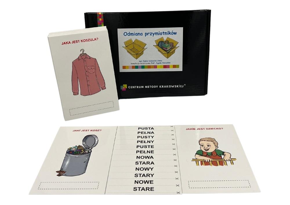 Zestaw składa się z 42 kolorowych obrazków. Przedstawiają one następujące przymiotniki w 3 rodzajach: