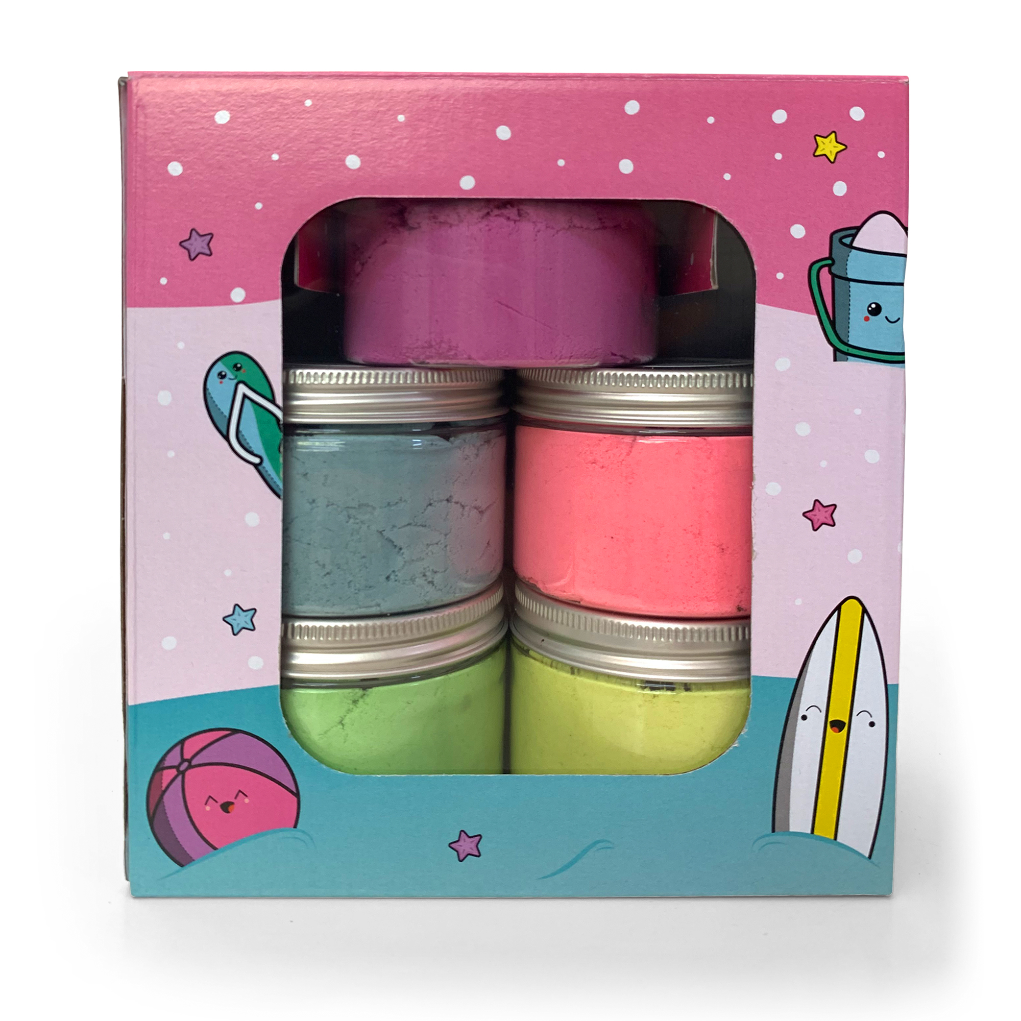 Zestaw zawiera 5 kolorów piasku kinetycznego: zielony, niebieski, żółty, różowy oraz fioletowy.