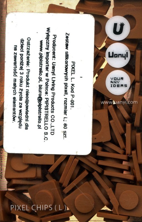 Zestaw 80 silikonowych pikseli , którymi możesz ozdabiać wszystkie przedmioty z serii UPixelbags klockami w rozmiarze L .