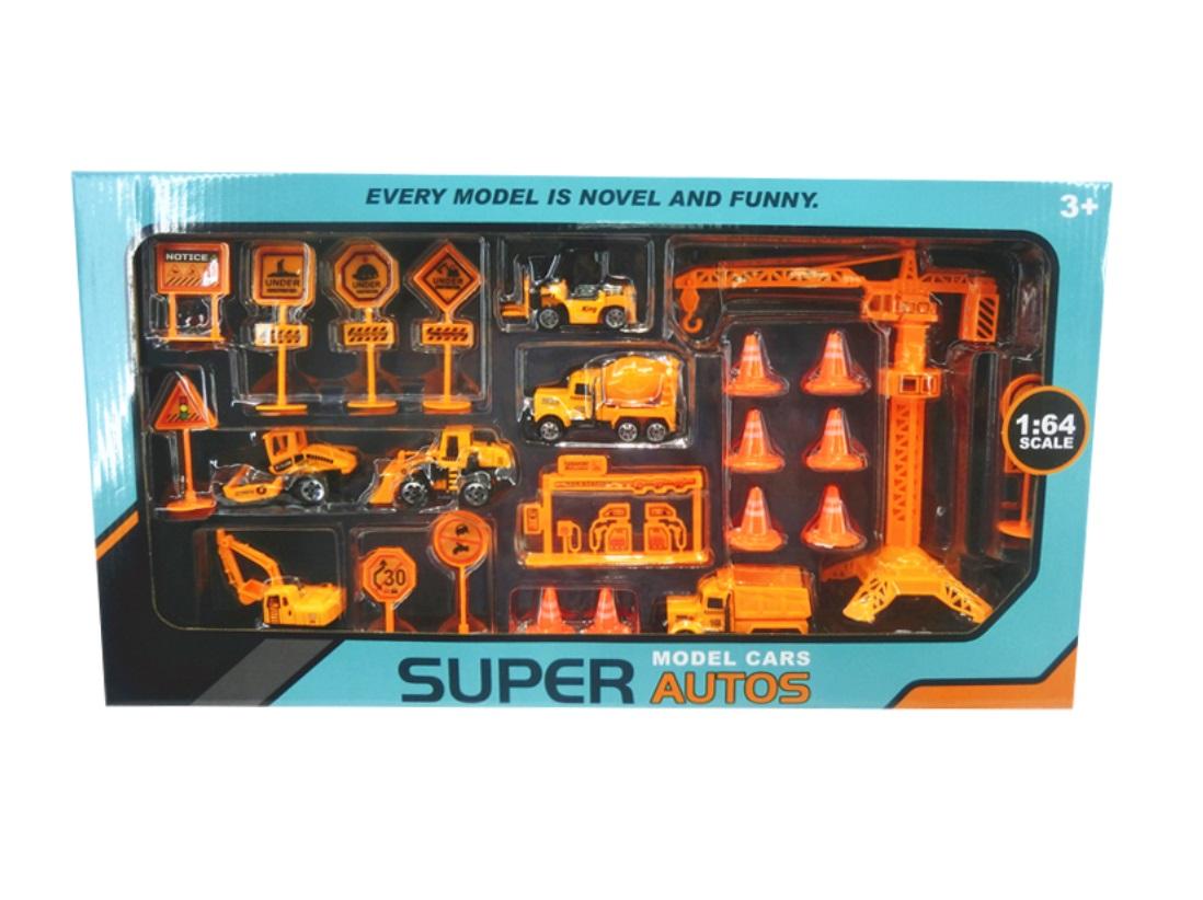Zestaw z wieloma pojazdami budowlanymi oraz dodatkami związanymi z prowadzeniem budowy.