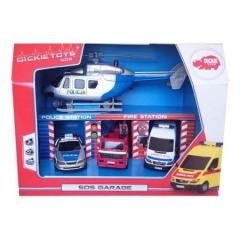Kartonowy garaż mieszczący helikopter, radiowóz, karetkę pogotowia i wóz strażacki z działającą sikawką.