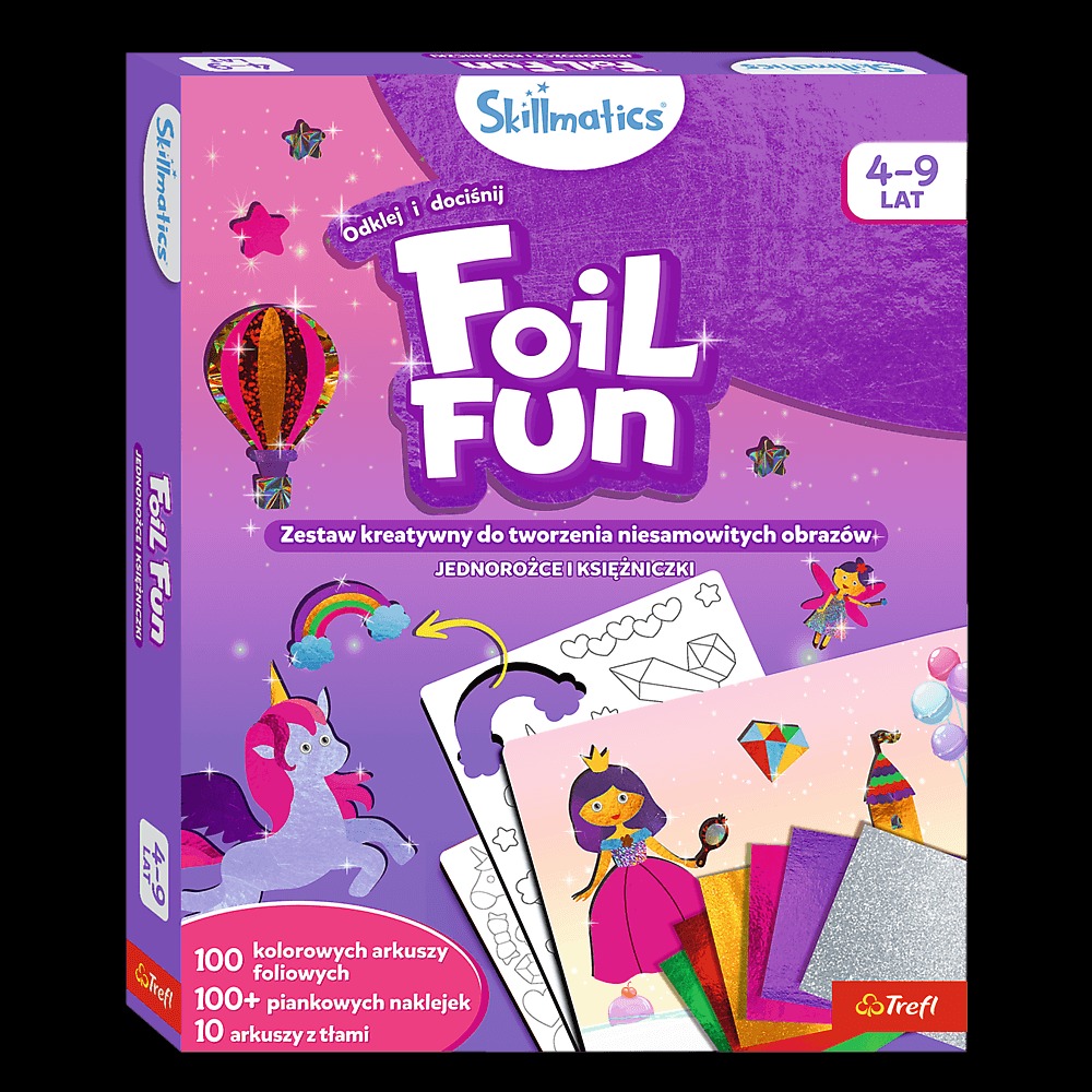 Seria Foil Fun to zestawy kreatywne, które pozwalają dzieciom ozdabiać obrazki bez użycia kleju i farb, co oznacza brak brudzenia i bałaganu idealne zarówno do domu, jak i w podróży! Przy użyciu foliowych arkuszy i piankowych naklejek dzieci mogą tworzyć połyskujące dzieła sztuki w prosty i angażujący sposób.