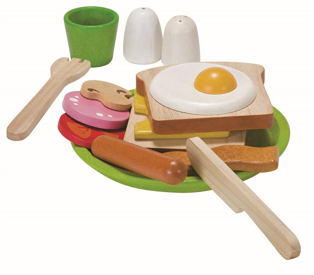 Pyszne śniadanko na dobry początek dnia! Apetyczny zestaw zawiera: kanapkę, jajko sadzone, bekon, parówkę, naczynia i sztućce.