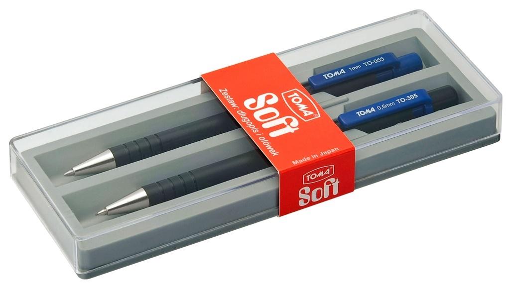 Zestaw produktów z ergonomiczną, przyjemną w dotyku obudową typu SOFT w etui upominkowym. Ołówek automatyczny z metalową końcówką, wysuwaną głowicą, grafity 0,5 mm, wbudowana gumka. Długopis Automatyczny z końcówką 1 mm, z wymiennymi wkładami.