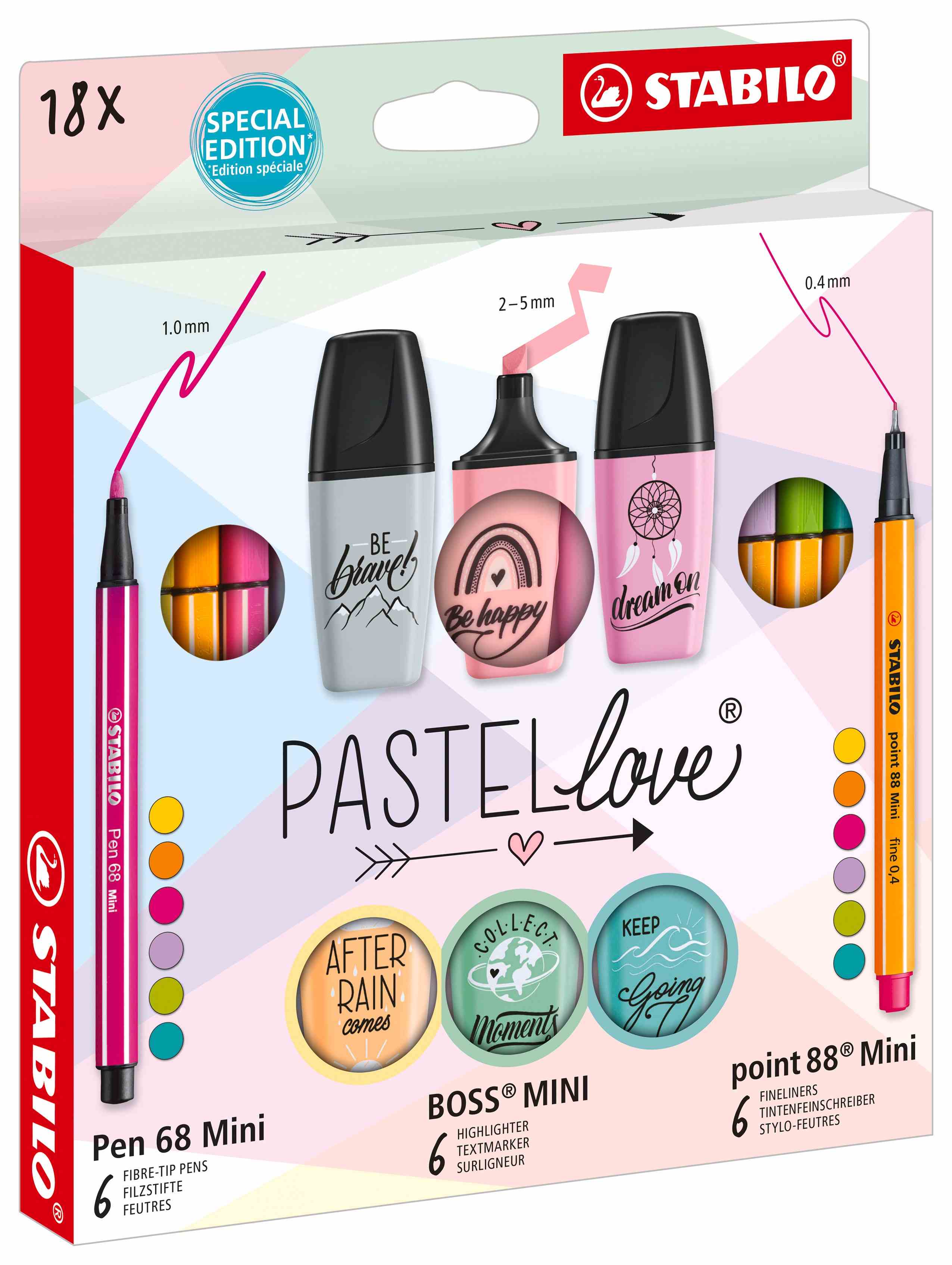 Doskonale znane mini cienkopisy STABILO point 88 Mini, flamastry STABILO Pen 68 Mini oraz zakreślacze STABILO BOSS MINI pastel zostały zapakowane w efektowne etui. Doskonały pomysł na prezent lub każdą inną okazję. Zestaw 18 pastelowych produktów: po 6 szt. zakreślaczy, cienkopisów, flamastrów w mini formacie.