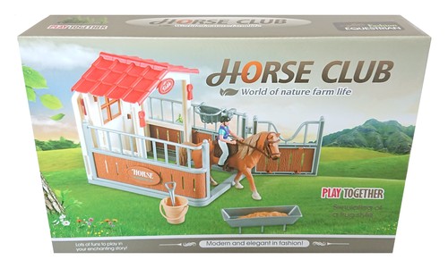 Zawiera stajnię, konia z jeźdźcem i akcesoria.