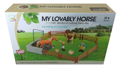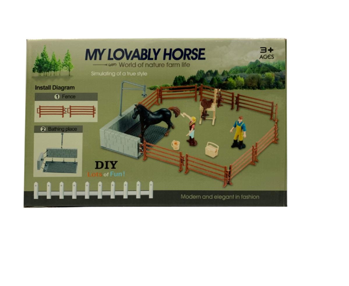 Zawiera koński prysznic, ogrodzenie, figurkę konia i dwóch opiekunów oraz akcesoria.