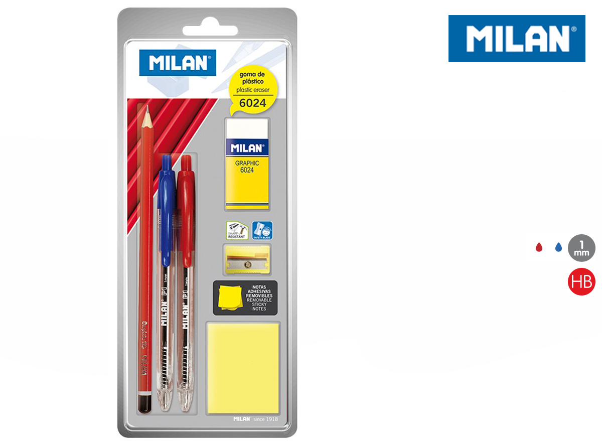 Zestaw zawiera: 2 długopisy P1, ołówek sześciokątny HB, gumkę 6024, temperówkę, bloczek karteczek. 2 długopisy P1 z przezroczystą obudową. Pstrykane. Przycisk i klips są tego samego koloru co tusz. Przybliżona długość pisania: 1200 metrów. Końcówka 1 mm. Ołówek sześciokątny HB. Posiada unikalny system Lead Protection System (LPS), który zwiększa odporność grafitu na złamania poprzez przyklejenie go do drewna. Drewno pochodzi ze zrównoważonych plantacji. Miękka i delikatna biała gumka plastikowa 6024 GRAPHIC do usuwania pociągnięć ołówka z dowolnej powierzchni. Temperówka na cienkie ołówki i kredki. Ma ostre i wytrzymałe ostrze ze stali węglowej, dzięki czemu idealnie nadaje się do wszystkich rodzajów ołówków. Posiada system bezpiecznych ostrzy, który zapobiega odłączeniu się ostrza od korpusu temperówki. Karteczki samoprzylepne, jasno-żółte 50 x 38 mm. Rozmiar blistra: 24,5 x 10,5 x 2 cm.