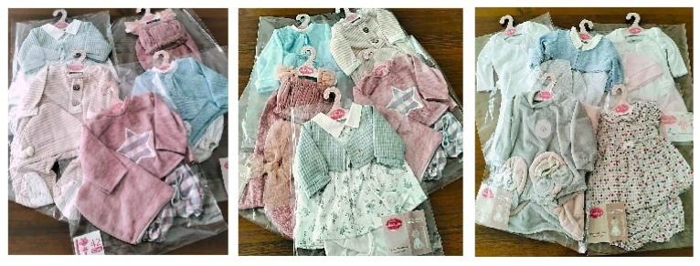 Pakiet ubranek dla lalki 42 cm 5 szt. Antonio Juan 91042 Zestaw strojów dla lalek - bobasów o wysokości 42 cm marki Antonio Juan zawiera 5 sztuk losowo wybranych ubranek (mix). Staramy się zachować różnorodność kolorystyki i fasonów. Mogą to być np.: sukienka, sukienka z bolerkiem lub krótkimi spodenkami, bluza lub body z półśpiochami lub krótkimi spodenkami, body lub body z czapeczką, piżamka, kostium dla lalki. Stylowe ubranka, szyte ręcznie z wysokiej jakości tkanin, są umieszczone na tekturowych wieszaczkach z logo marki Antonio Juan i zapakowane w foliowe opakowania.