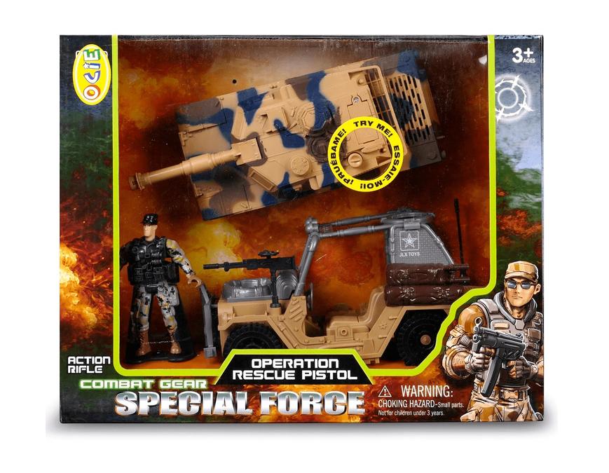W zestawie: czołg, żołnierz, jeep wojskowy. Funkcje: dźwięk, światło - czołg. Wiek: 3+Wymiary opakowania: 32x25,5x10,5cm.