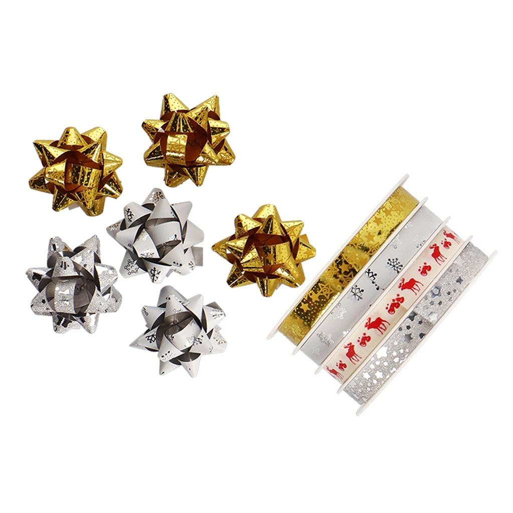Zestaw wstążek z rozetkami - 4 wstążki: 1cm x 4m + 6 rozetek 4cm czerwony, srebrny, złoty z wzorami