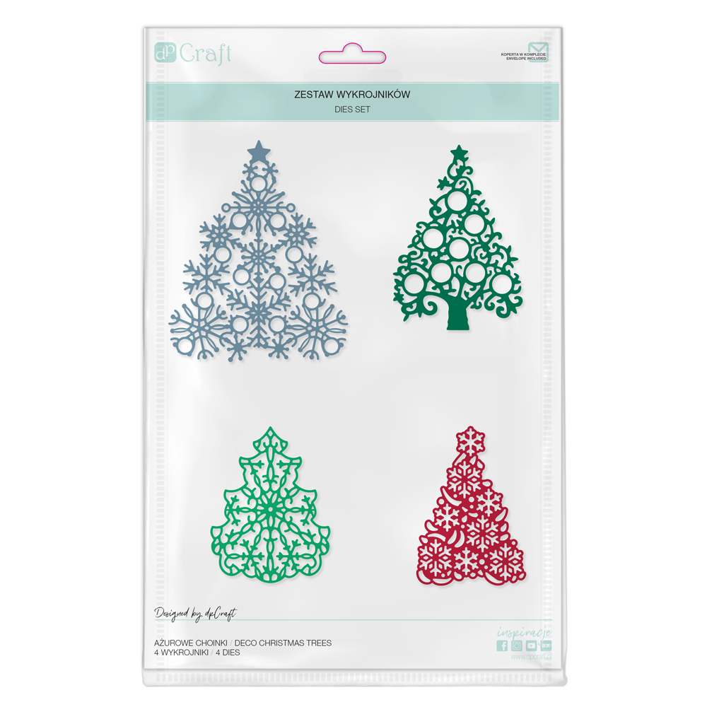 Zestaw wykrojników "Choinki" jest dedykowany maszynce tnąco-wytłaczającej dpCraft, ale także jest kompatybilny z wszystkimi dostępnymi na rynku maszynkami tego typu. Wykrojniki wycinają w papierze do 300g, tekturze oraz piance. Idealne do wszelkich projektów o tematyce świąteczno-zimowej typu cardmaking, scrapbooking, home decor i wielu innych. Warto wykorzystać Świąteczny czas na spotkanie się z bliskimi, przyjaciółmi i znajomymi, dzięki wykrojnikom możesz stworzyć kartkę z życzeniami własnej roboty. Wykrojniki są zapakowane w estetyczną i praktyczną plastikową kopertę. Koperta jest wielokrotnego użytku i służy do przechowywania wykrojnika.
