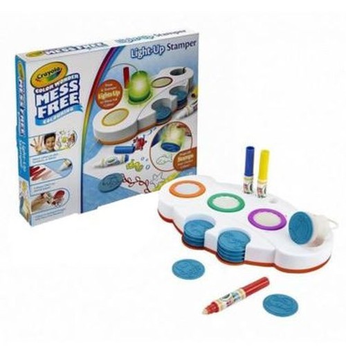 Color Wonder zestaw z poświetlanymi siempelkamiZestaw z podświetlanymi stempelkami zapewnia godziny twórczej zabawy bez żadnego bałaganu. Dzięki specjalnym atramentom, które pojawiają się tylko na papierze Color Wonder rodzice nie muszą się martwić już o czyszczenie. Tusz Color Wonder nie jest widoczny na ścianach, dywanach, ubraniach czy skórze. Błyszczący magicznie atrament pojawia się tylko na specjalnym papierze Wonder Color.Dziesięć stempli o tematyce morskiej pozwoli dzieciom tworzyć własne, unikatowe historie i dzieła podwodne. Podstawa zawiera dwa zagłębienia do przechowywania niewykorzystywanych stempli . Młodzi artyści będą zachwyceni efektem podświetlenia stempla. Stempel będzie wskazywał, którego koloru aktualnie używasz poprzez podświetlanie jego obudowy. Kiedy zanurzysz go w purpurowym tuszu zacznie palić się na purpurowo, kiedy zanurzasz go w pomarańczowym tuszu - na pomarańczowo i zielono, gdy zanurzasz się w zielonym tuszu.Eksperymentuj z efektami koloru marmuru poprzez zanurzenie w wielu kolorach podkładek stemplowych. Zestaw zawiera trzy kolory atramentu, a także markery Color Wonder w kolorze czerwonym, żółtym i niebieskim, aby ozdobić stemplowane dzieła