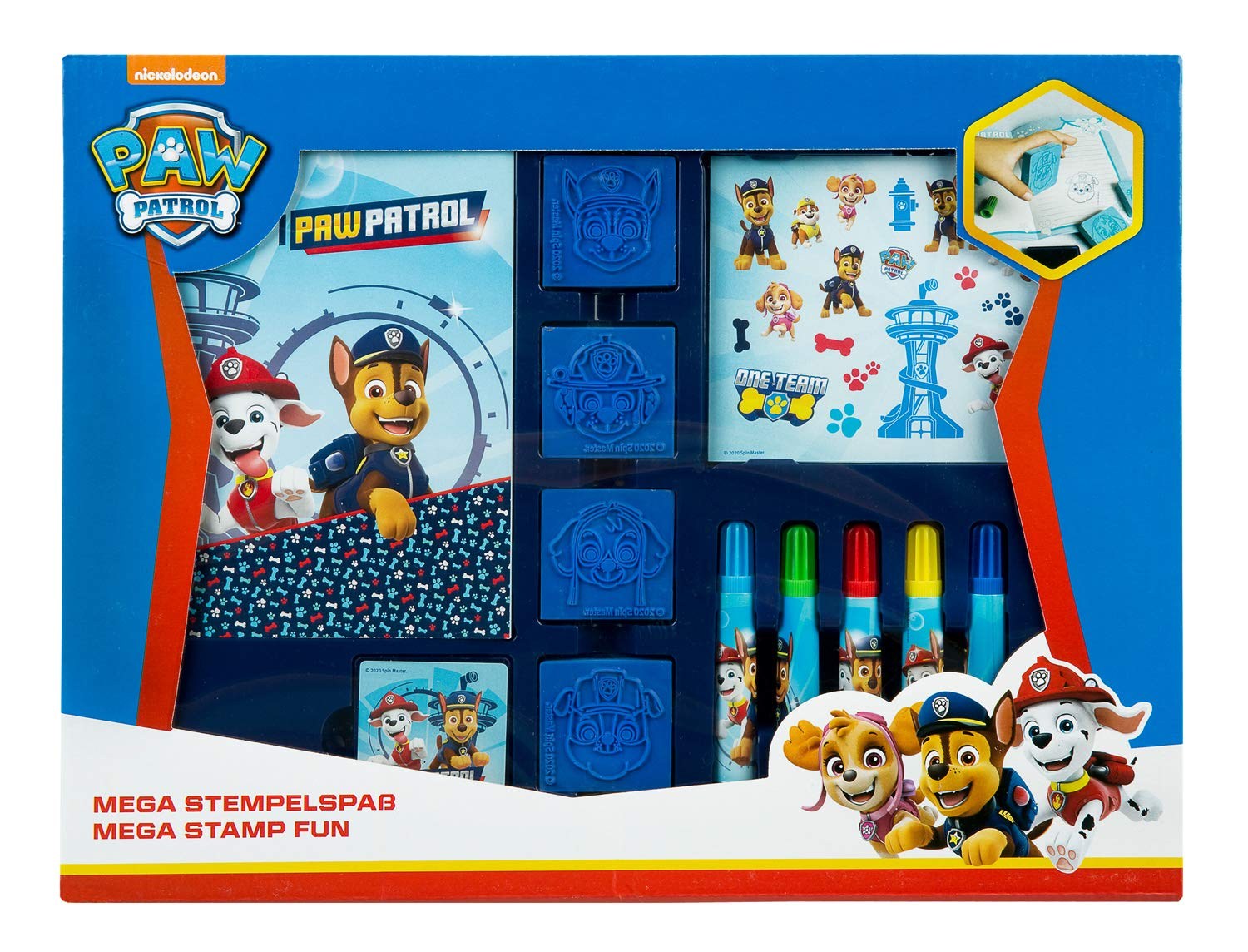 Kreatywny zestaw z ulubionymi postaciami z bajki Psi Patrol. Zawartość: 4 pieczątki, 5 pisaków, 1 notatnik, plastikowe pudełeczko z gąbką nasączoną nietoksycznym tuszem, zestaw naklejek.