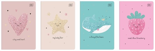Format: A5. Liczba kartek: 32. Zadruk w kratkę. Zaokrąglone rogi. Efektowna i przyciągająca wzrok, kolorowa okładka, wybiórczo pokryta błyszczącym brokatem.