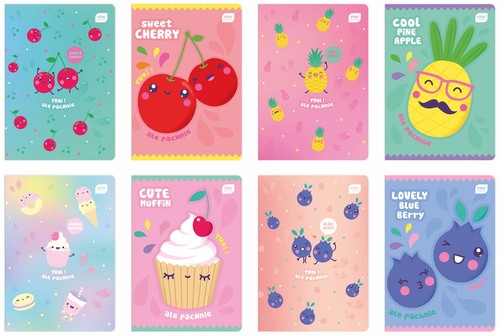 Format: A5. Liczba kartek: 32. Zadruk w kratkę. Zaokrąglone rogi. Apetyczne zeszyty z pięknie pachnącymi okładkami w 4 zapachach: wiśni, ananasa, borówki i słodkim. Aby uwolnić zapach, należy potrzeć wyznaczone miejsce na okładce.