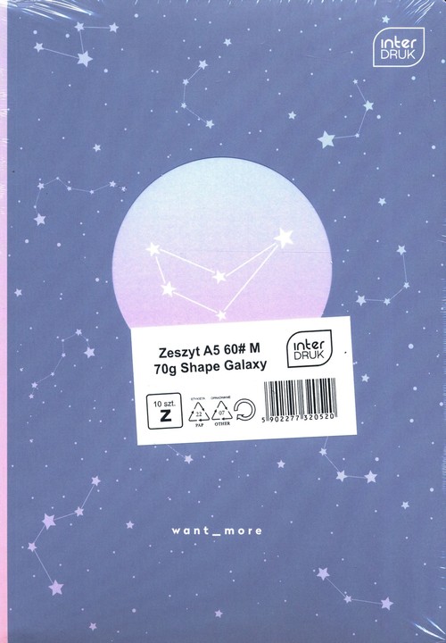 Format: A5. Liczba kartek: 60. Zadruk w kratkę. Zaokrąglone rogi. Marginesy. Okładka wyróżnia się modnym wycięciem, które stanowi zarys graficzny, a wraz z kolorową kartką umieszczoną pod okładką tworzy estetyczny i kolorowy obrazek.
