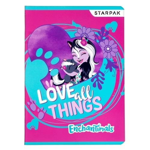Zeszyt A5, 16 kartek w linie, w miękkiej oprawie. Oprawka zdobiona grafikami z bohaterami Enchantimals. Zeszyt dostępny w dwóch wersjach graficznych.