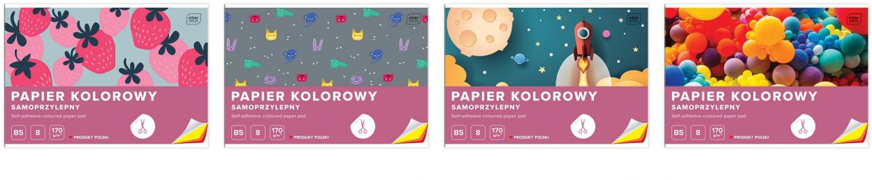 Zeszyt papierów kolorowych samoprzylepnych. Format B4, 8 kartek. 10 sztuk w opakowaniu zbiorczym. Producent Interdruk.