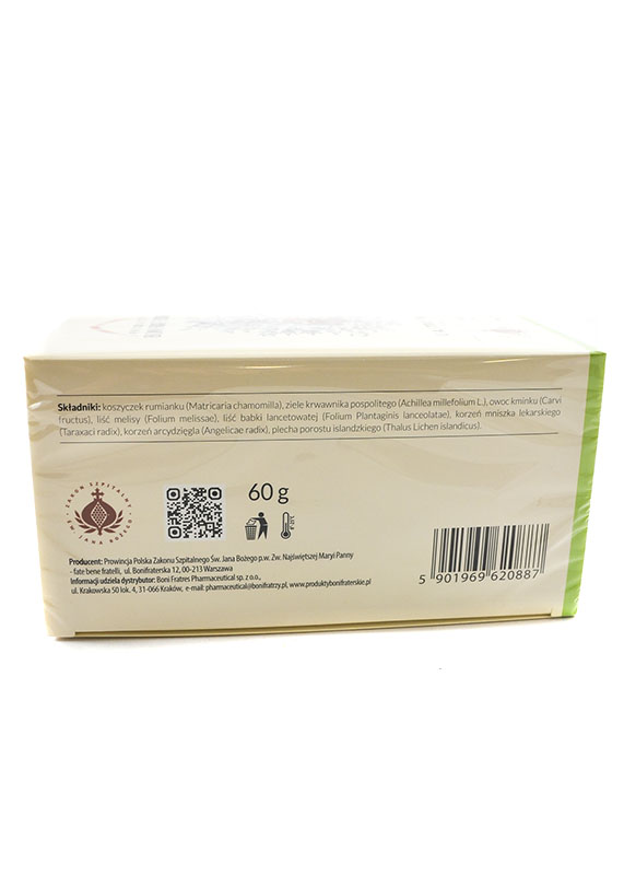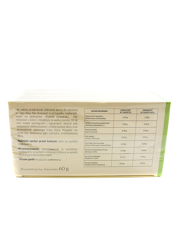 Koszyczek rumianku (Matricaria chamomilla), Krwawnik pospolity (Achillea nano), Owoc kminku (Carvi fructus), Liść melisy (Folium Melissae), Liść babki lancetowatej (Folium Plantaginis lanceolatae), Korzeń mniszka (Taraxaci radix), Korzeń arcydzięgla (Angelicae radix), Porost islandzki (Thalus Lichen islandicus).