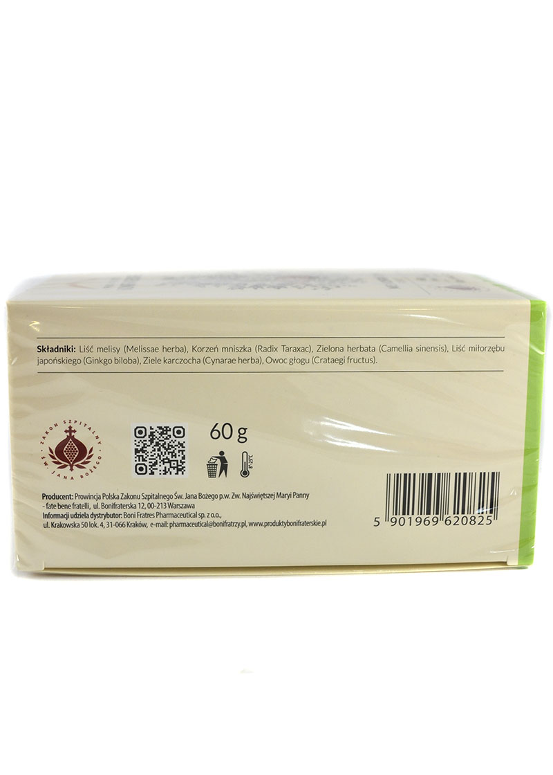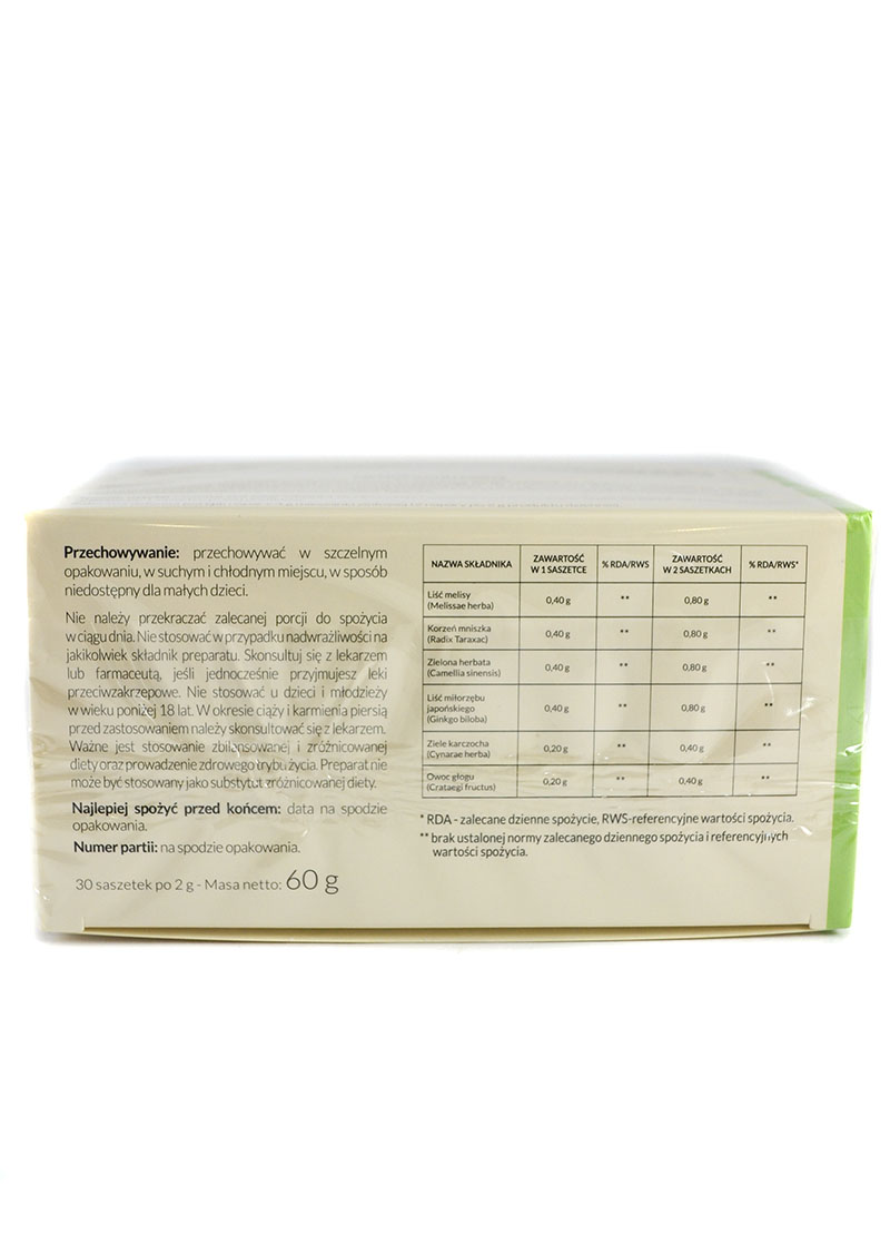 Liść melisy (Melissae herba), Korzeń mniszka (Radix Taraxac), Zielona herbata (Camellia sinensis), Liść miłorzębu japońskiego (Ginkgo biloba), Ziele karczocha (Cynarae herba), Owoc głogu (Crataegi fructus).