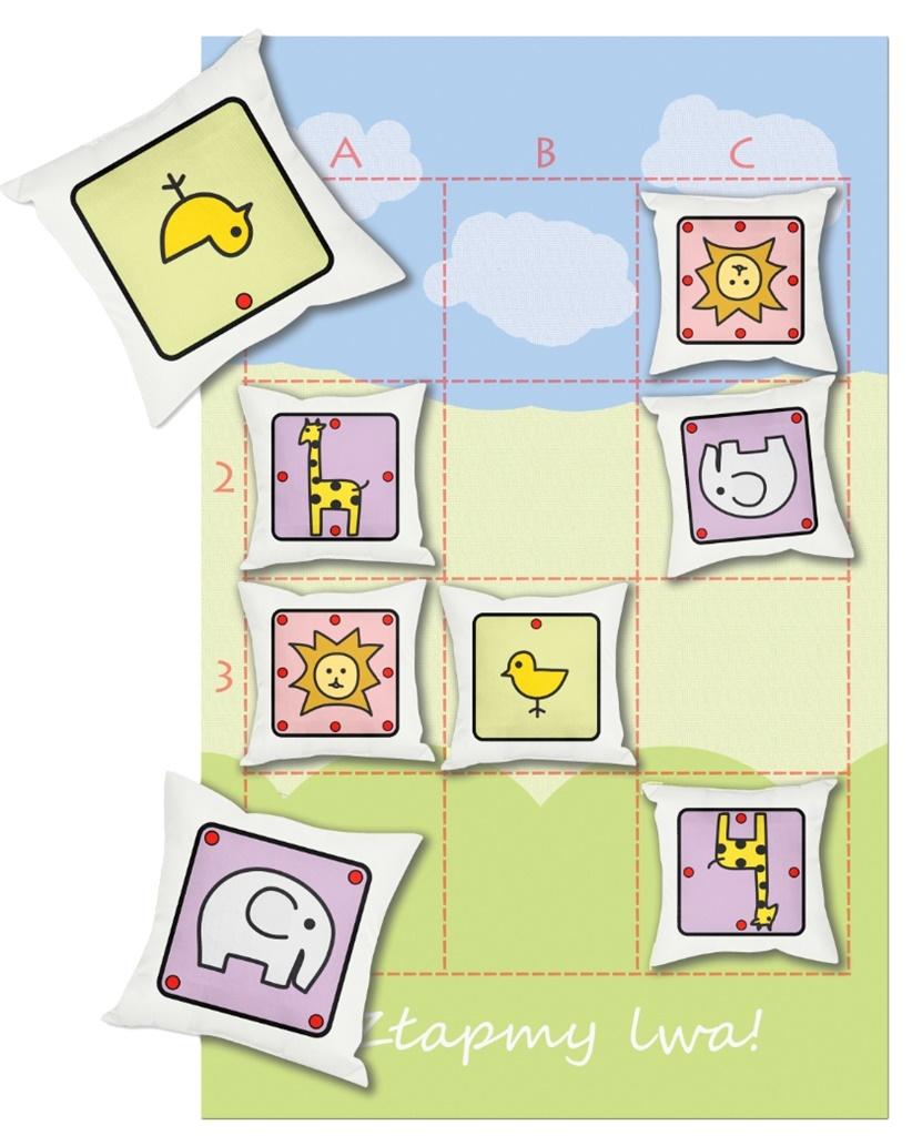 Złapmy lwa wersja dywanowa w formie wielkowymiarowej gry składa się z kolorowej planszy i poduszek (plansza ma wymiar 150 na 220 cm, osiem poduszek ma wymiar 40 na 40 cm).