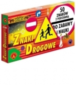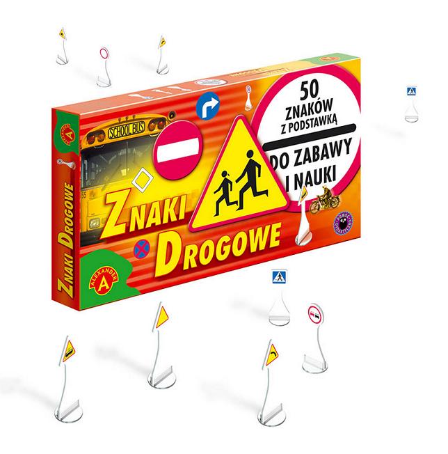Znaki drogowe"" - pudełko zawiera 50 najważniejszych znaków drogowych. Wycięte z tektury znaki osadzone są na plastikowej podstawce. Komplet znaków to znakomity rekwizyt uzupełniający zabawę samochodami. Stanowią one również rozszerzenie innych produktów firmy ""Alexander""- ""Ulice miasta"" i ""Buduję swoje miasteczko""