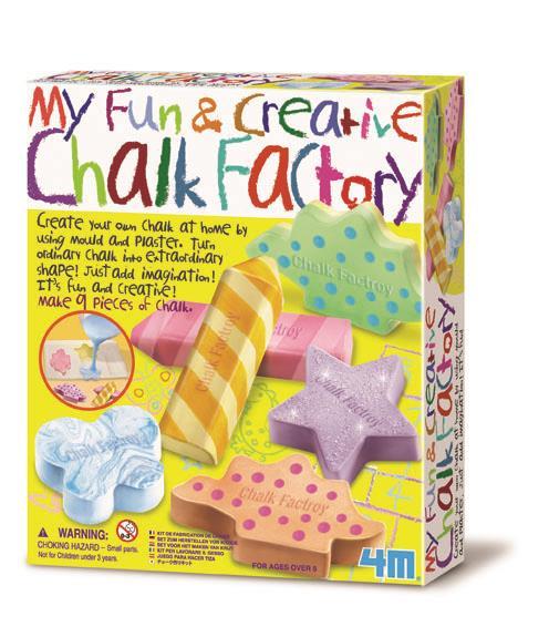 Stwórz swoją własną fabrykę kredy w domu. Wystarczą jedynie tynk i forma do tworzenia niezwykłych kształtów!Odmień zwykłą, nudną kredę w niebanalne narzędzie o wyjątkowym kształcie. Z odrobiną Twojej wyobraźni stworzysz ciekawe dzieła sztuki, którymi zaskoczysz swoich znajomych!To nie koniec zabawy. Kiedy już stworzysz swoją kolorową i kształtną kredę, będziesz ją mógł potem wykorzystać w dowolnym projekcie artystycznym!Uwagi: Powyżej 5. roku życia.Zawartość: 3 woreczki gipsu, 1 forma, 3 tubki farb, 1 woreczek z brokatem, 1 mieszadło, 1 pędzel, 2 kredy do wykonywania kolorowej kredy, szczegółowe instrukcje. Zawartość wystarcza na zrobienie 9 sztuk kredy.