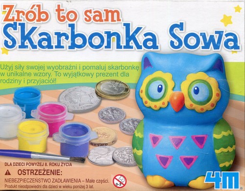 Zawartość: mini skarbonka, 1 pasek z farbkami, pędzelek, instrukcja.