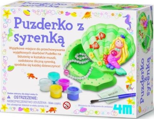 KREATYWNA ZABAWAPUZDERKO Z SYRENKĄZRÓB TO SAMDla dzieci powyżej 5 lat.Zestaw nieodpowiedni dla dzieci poniżej 3 lat.UWAGA:ZALECANA JEST POMOC OSOBY DOROSŁEJ.ZRÓB TO SAM? ŁATWE DO WYKONANIA?Zestaw do samodzielnegowykonania puzderka z syrenką.Wyjątkowe miejsce do przechowywania wyjątkowych skarbów! Pudełko na biżuterię w kształcie muszli, ozdobione śliczną syrenką. Spodoba się każdej dziewczynce!To super zabawa!BAW SIĘ I UCZ JEDNOCZEŚNIE!ZAWARTOŚĆ: 1 opakowanie szybkowiążącego proszku gipsowego 1 zestaw do formowania 1 perełka 1 pasek farbek 1 pędzelek 1 opakowanie brokatu instrukcja.Biżuteria nie dołączona do zestawu.