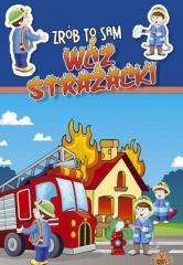Książka zawiera kartonowy model samochodu strażackiego do samodzielnego montażu, wraz z podstawą - fragmentem jezdni, płonącą ścianą budynku oraz strażakami.